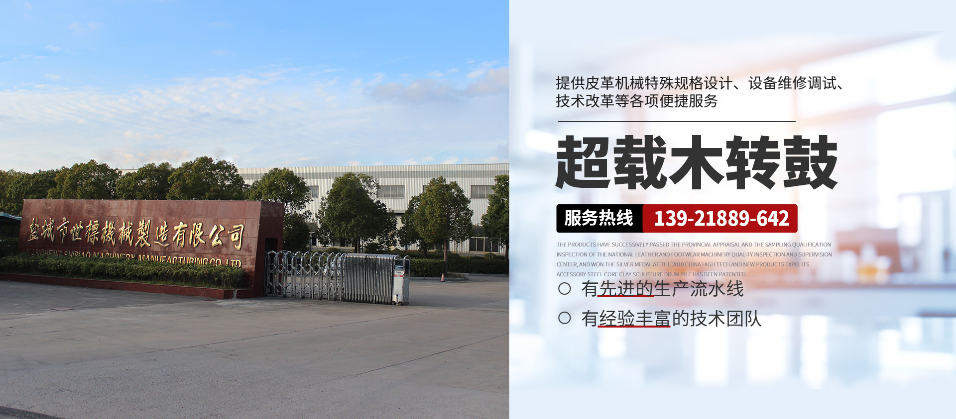 本公司常年提供超載木制轉(zhuǎn)鼓( 意大利/西班牙版本)、GJOB1-2型懸掛式木制轉(zhuǎn)鼓、鐵制轉(zhuǎn)鼓、Y型不銹鋼全自動分格鼓、全自動不銹鋼圓形、八角形摔軟轉(zhuǎn)鼓、PP染色等多功能轉(zhuǎn)鼓、HC系列劃槽、不銹鋼試驗轉(zhuǎn)鼓等皮革機械產(chǎn)品,產(chǎn)品暢銷浙江、山東、廣東、福建、河南、河北、四川、新疆、遼寧等地,且遠(yuǎn)銷非洲、東南亞、南美洲、中美洲等多國,深受各大制革廠家的青睞。產(chǎn)品相繼通過省級鑒定和全國皮革、制鞋機械質(zhì)量檢測監(jiān)督中心的抽樣合格檢驗,在2010中國高新技術(shù)、新產(chǎn)品博覽會上一舉榮登銀獎寶座,其配件鋼芯泥塑鼓樁獲 專利權(quán)。本公司并向客戶提供皮革機械特殊規(guī)格設(shè)計、設(shè)備維修調(diào)試、技術(shù)改革等各項便捷服務(wù),具有健全的檢測體系和可靠的售后服務(wù)。